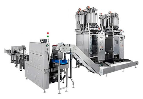 Это комплексная линия для упаковки различных жидких и пастообразных продуктов, таких как соусы, мед, шампунь и соки. Она выполняет формование сашетов, наполнение, запайку и автоматическое картонирование. Машина (LD560BY) работает с 3-12 рядами, достигает скорости до 50 циклов в минуту, производит сашеты размером Д:50-180 мм х Ш:17-90 мм и дополняется картонажной машиной (LD200ZH), которая обрабатывает 30-60 коробок в минуту.