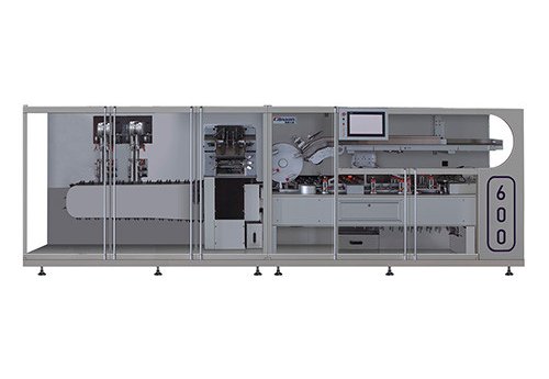 This is a fully automatic continuous high-speed system for boxing aluminum-plastic blisters, bottles, tubes, and pouches. It features a dial scale handwheel for easy specification changes, servo-driven swinging tracking feeder for fast and accurate placement, and overload protection. Electrical and pneumatic components are from international brands. Suitable for forming complete packaging lines.