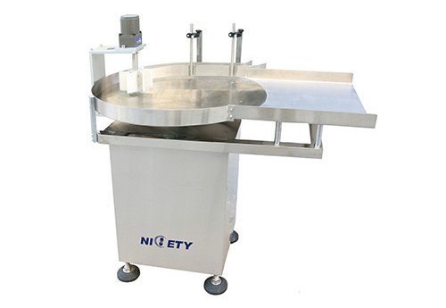 The Turn Table is a feeding system where operators manually place upright bottles onto a rotating platform, which then automatically and orderly delivers them to a conveyor. It handles various bottle materials (plastic, glass, ceramic, metal) and shapes, making it ideal for larger containers and low-capacity production lines. The machine operates at a speed of 80 bottles per minute, is easy to use, and requires no special operator training.