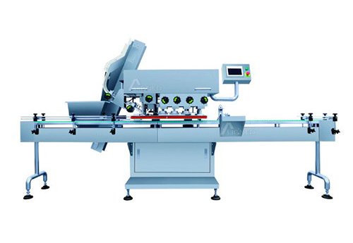 This machine is suitable for capping various kinds of vessels (round type, flat type, square type) and widely used in such fields as pharmaceutical, foods, chemistry, etc. The machine works reliably and operates easily. When a bottle already filled with materials enters the entry of the main machine, the cap drops through the cap feeder rail and covers the bottle. Applicable cap diameter is 25 – 70 mm, applicable vessel diameter is 35 – 140 mm.