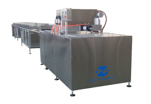 The chocolate chip depositing machine can produce smallest 0.098g chocolate chips and big chocolate drops. The depositor can be pneumatic or servo motors. There is a cooling tunnel to cool down chocolate chips. The width of the conveyor belt can be from 600mm to 1200mm. Capacity: 180-200 kg/h