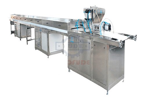 This machine is designed for depositing chocolate chips. The chocolate drops/chips can be poured on the conveyor belt directly, and the weight of each drop can also be adjustable. The material of the line which touches the chocolate is made of stainless steel or aluminum alloy, except the, con-vey belt is made in PU. The insulation board can also be stainless steel as an option.