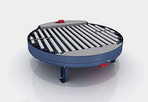 The 90-Degree Turntable Conveyor is used to rotate products at 90 degrees. Powered CDLR transition rollers, mounted on the turntable deck's apron, help move the product on and off the turntable. Optional transition gravity roller sections (to fill gaps created by radius of turntable) are available.