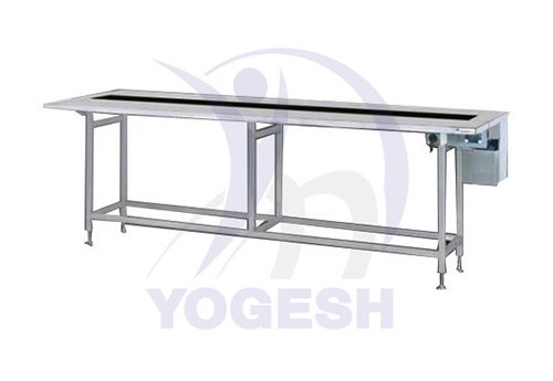 The packing conveyor belt is a table like structure. It has stain less steel table top. There is a moving endless sandwich belt in the centre. There is a 12 inches working space on both side of the conveyor belt. The space can be used for final visual inspection and final packing.