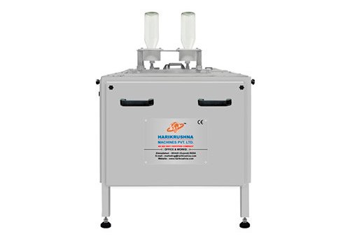 The Machine is designed for cleaning 500 ml glass bottles. Constructed from SS 304, it features two tanks and processes two bottles at once. An operator manually loads bottles into brushes for washing and then transfers them to a rinsing unit. With a capacity of 20 liters per tank, it achieves an output of 10–15 bottles per minute.