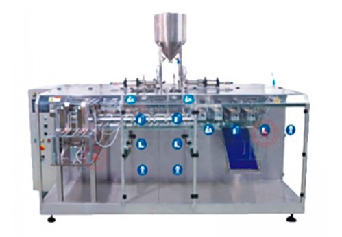 The machine is designed for packaging liquid products or paste products into premade stand up spout pouches or premade bags. It can do filling and sealing for such bag types as doypack, spout pouch (with nozzle or cap in the corner of the pouch), four sides sealed bag, paper bags, etc.