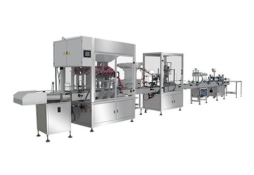 This filling line, by combination of liquid filling machine, bottle unscrambler, cap loader, capping machine, labeling machine, is suitable for filling edible oil, honey, coconut oil, soy sauce, tomato sauce, peanut butter, etc. into cans, jars and bottles. Filling speed is up to 100 BPM.