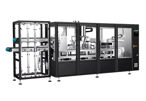 This is a custom-built fully automatic In-line filling and sealing machine. It is suitable for packaging a wide range of liquid, paste, granulated and powdered products, you can use this machine to fill dairy products, soluble powders, tea and coffee, salads, dressings, desserts, dry soups, frozen dished, cosmetics, and so on.