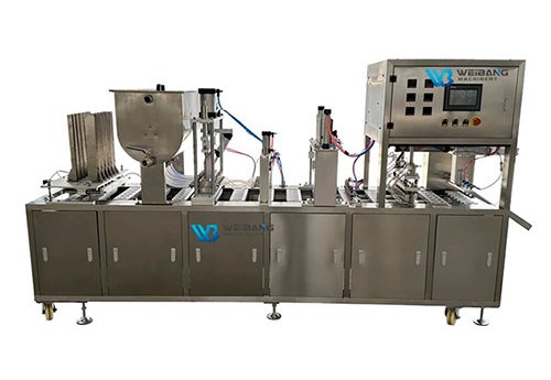 This machine is the mufti-functional and advanced yogurt cup filling machine. It is featured with automatic dispensing cup, twice filling, twice sealing, cover pressing and exit of 2,4,6,8,10 cups one time. It is suitable to milk, juice, honey, water and granular, powder, fruit, crisp and so on.