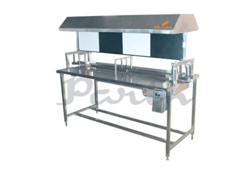 Inspection table is equipment consisting of a three-track conveyor with a hood with lighting arrangement and visual inspection background of alternate black & white color. Inspection table (Inspection Conveyor) have stainless steel structure with moving S.S. slat chain. Output: 150 containers / minute