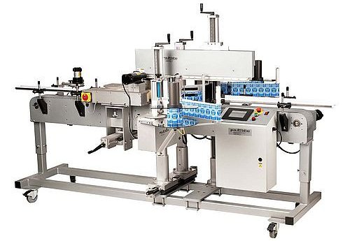 A complete system for front and back labeling of oval, square or rectangular products. Standard features include a feed screw assembly, (or orientation belts), top hold down belt, control panel, power wipe down rollers and two adjustable label applicators. This system is designed for accurate label placement for many types of containers. All 600SE series systems are standard with component speed following and pre-set recipes.