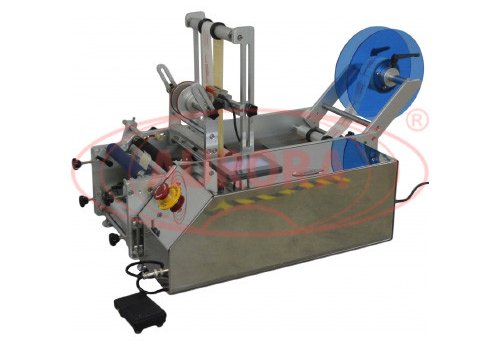 Semi-automatic labeler for simultaneous application of the front and back labels AE-2 Plus is designed for applying self-adhesive labels on cylindrical and conical containers. This desktop label applicator can be used in chemical, food, cosmetic and pharmaceutical enterprises. Output is 600 pcs/h.