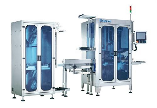 Automatic shrink machine ESM-600/800 for marking empty and round bottles of food and beverages (soda, mineral water, dairy products, juices, edible oil, condiments, etc.), detergents and industrial products. The machine has the ability to smoothly launch from 200 BPM to 600 BPM, which effectively solves the problem of the drop of the first bottle, which easily occurs when a high-speed start.