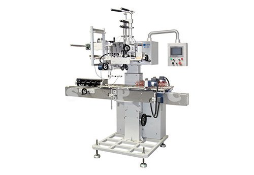Designed to apply sleeve labels on various kinds of bottles, such as round, square, barreled, etc. Servomotor drive, controlled by PLC, parameters are set via HMI on touchscreen, equipped with frequency converter, transducer and positioning module. Output is 100 – 200 bottles per minute.