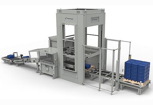The AC-200 Series Automatic Compact Palletizer combines the advantages of a robotic palletizer with traditional palletizing technology. This compact palletizer features an innovative automatic gripper that guarantees exact positioning of each unit onto the pallet. A four-axis system is used to precisely pick the unit from a pick-up conveyor and place it on the pallet. In its basic version, the empty pallet is manually placed into the machine and the full load is removed with a forklift truck. As an option, automatic pallet handling can be added to the infeed or outfeed of the system.