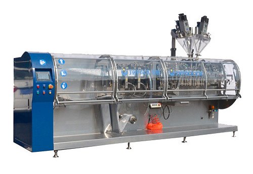 The machine can perform motor film-releasing, film forming, bottom sealing, vertical sealing, cutting, filling, pouch transferring and top sealing. The cams on the main shaft finish the coordinated action driven by the motor and the encoder on the main shaft feedback the position single. Capacity is up to 60 pouches per minute.