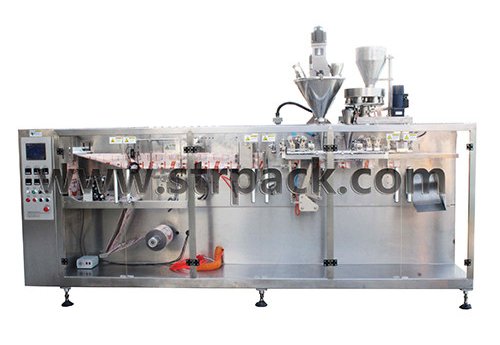 This horizontal type pouch making and packing machine is with function of pouch forming, filling and sealing. It makes 3-side seal flat pouch, 4-side seal flat pouch. Output depends on the model and varies between 30 and 80 pouches per minute.