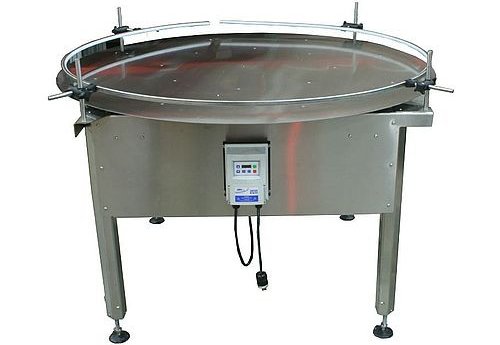 Features: 60 inch diameter table manufactured in 1/8” width 304 stainless steel. Support of stainless steel disc by ½ inch aluminum plate. Main structure manufactured in 2 inch stainless steel square tube. Includes stainless steel covers on 4 sides Power provided by 1/4 Hp, DC gear motor. Speed control by potentiometer. Variable speed up to 150 containers per minute.