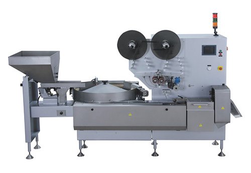 The JH-Z1300 is a horizontal high-speed wrapping machine for hard candy in fin seal (pillow pack). he standard machine is equipped with a sorting station to eliminate sugar dust and chips, a wrapping material feeding system with 2 reel holders and automatic splicer. Output: up to 1300 pieces/min