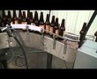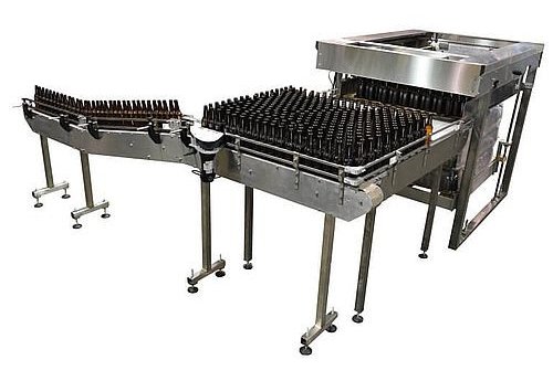 Half-stack pallets are placed into the depalletizer frame using a forklift or pallet jack. Once inside the frame, the operator will cut and remove the shrink wrap, exposing the top layer of bottles. An operator interface will allow the user to start the process, and the pallet will be raised to the correct level so that the base of the top layer is level with the feed table. A motorized pusher bar will engage and push bottles out onto the feed table, starting and stopping as bottles are needed. Bottles will transfer out onto the feed table, and from there be fed onto the right-angle conveyor. The table, conveyor and pusher belt turn on and off automatically based on a downstream photoeye indicating the need for bottles. If the line is full the system waits until bottles are needed and then restarts.