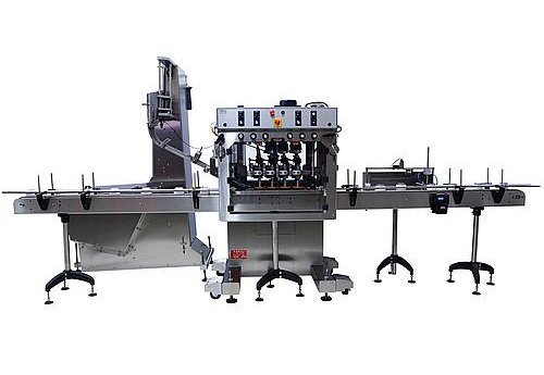 Tightener Features Heavy duty 304 stainless steel welded C frame for easy mounting over existing conveyors. Heavy duty linear carriage system for height adjustability All shafts and threaded rods manufactured in 304 stainless steel Heavy duty casters standard No change of parts needed for a wide range of containers Front covers with safety interlock switches standard Top driven to insure no product spillage into drive assembly Adjustable height to accommodate containers from 1 inch to14 inches tall (Optional power height adjustment). 4, 6, or 8 spindle machine configurations available, single gear box driven Independent spring loaded bottle capping discs for better torque and misalignment forgiveness.