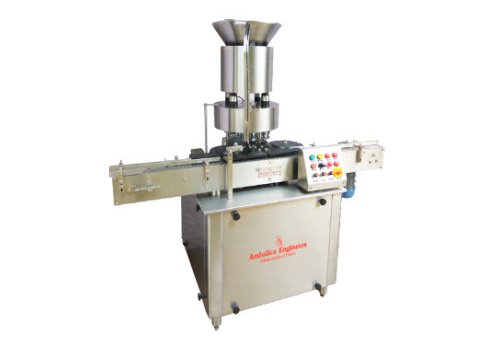 Duly Stoppered vials are fed on the conveyor enter into the infeed star wheel which transfers it to center star wheel under sealing head. Aluminum caps kept in vibratory bowl automatically orient caps in right direction before entering the delivery chute. Applicable containers must be within 16 – 52 mm in diameter and 25 – 110 mm in height. The machine can work with caps 13, and 20 mm in diameter.