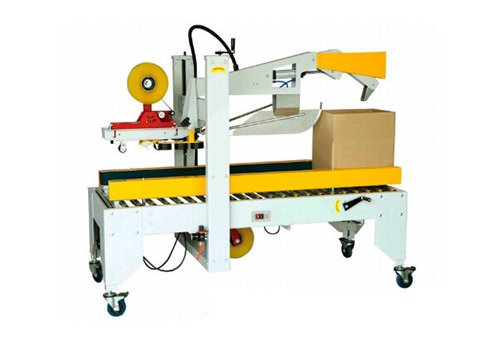 This is an automatic cover folding and sealing machine for cartons. It automatically folds the top cover and seals both top and bottom with tape. It features manually adjustable width and height settings to accommodate different carton sizes. It can operate independently or within an automated packaging line.