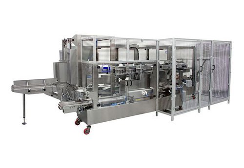 This machine is an all-in-one case packer with minimal installation space, automatic case forming, automatic top-bottom case sealing, automatic in-feed system with universal product stacker, automatic servo driven product inserter and optional Nordson glue system.