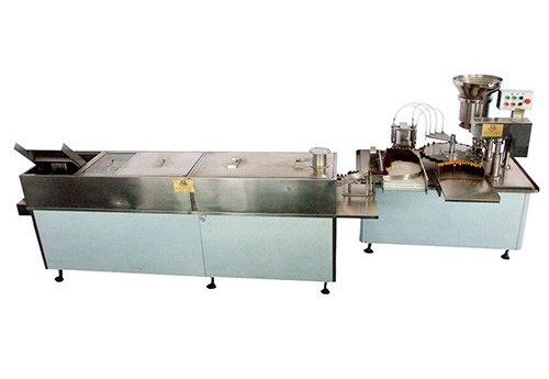 Designed for filling 10 – 20 ml vials with peroral pharmaceuticals. The unit performs washing, drying and filling automatically. PLC control, parameters are set via touch screen. Capacity is 60 – 85 vials per minute.