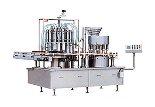 Designed for air blow and vacuum sucking cleaning of bottles,rotary liquid or syrup filling in bottles and screw capping. Equipped with system “No bottle — no filling, no bottle — no capping”. Eighteen filling and 9 capping heads are installed on the machine. Works with 50 – 200 ml glass and plastic bottles. Capacity: 120 – 180 bottlesperminute.