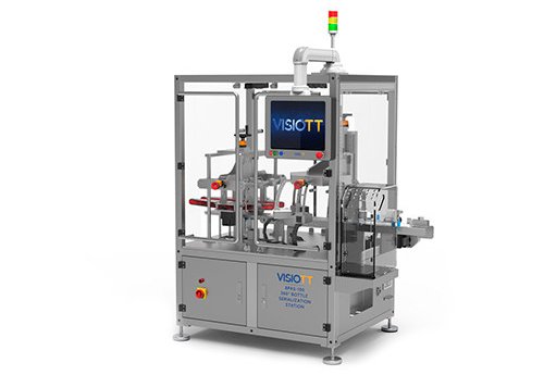 The system works on the principle of analyzing 2D code applied to the bottle with a label or another method with 360-degree vision inspection technology. It can also enable the application, control, and association of visible or invisible helper code to the top or bottom surface of the bottle. Capacity is 300 pcs per minute.
