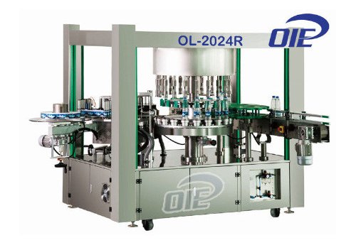 OPP hot melt adhesive labeling machine for rotary labeling on round containers. The machine guarantees the accuracy and stability of high speed sticker labels. Maximum marking speed: 24,000 bottles / hour
