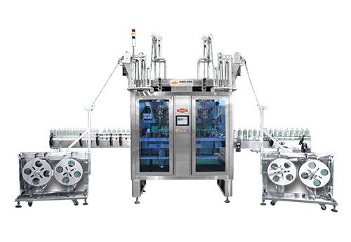 Designed to apply sleeve label on caps and bottles (overall, full body or fixed middle body). Max. speed: 600 bottles per minute. Film material: PVC/ PET/ OPS. The machine can be fully integrated within a production line; it is equipped with PC BASED control for increased accuracy and speed control.