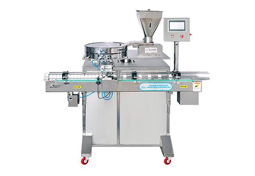 This Machine is a compact system for counting and filling capsules and tablets. It uses a photoelectric scanner and a rotary disc to orient and count a pre-determined quantity, featuring a PLC with HMI and a "no-bottle-no-fill" system. Requiring no change parts, it is available in Single Disc and Twin Disc models with output capacities of up to 30 and 50 bottles per minute, respectively.