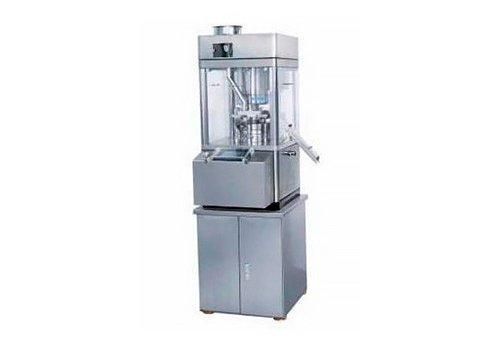 Single impeller force feeder, double forming process by per-pressure and main pressure. Bulk material from hopper (hopper can be filled manually or by using mechanical equipment like transfer vacuum powder) is poured into prior to tableting or compression, fill the die cavity, and are compressed by upper and lower punches into tablet. After compression, tablets are ejected by ejection adjuster.