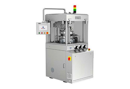 This is a single-sided rotary tablet press produced according to cGMP. It has 10-ton main compression and 2-ton pre compression. Turret with center drive. PLC controlled; parameters are set via HMI on a touchscreen. Equipped with 20 - 33 stations. Maximal tablet diameter is 25 mm, maximal filling depth is 20 mm. Output is up to 118,800 tablets per hour.