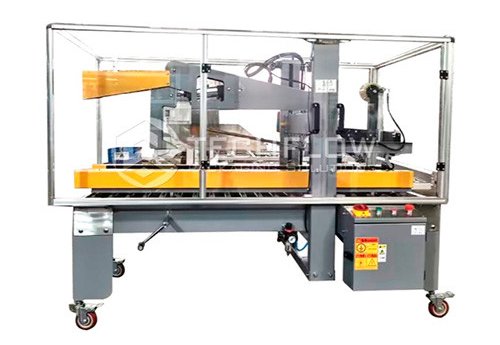 Эта машина подходит для запечатывания и упаковки картонных коробов, которая может ра-ботать автономно или использоваться на сборочных линиях. Тип уплотнения - липкая лента или термоклей-расплав. Производительность машины составляет до 30 коробов в минуту. Продукт по конвейерной цепи поступает в упаковочную машину и передается механизму подачи короба, который зажимается с двух сторон специальной лентой и перемещаются вперед.