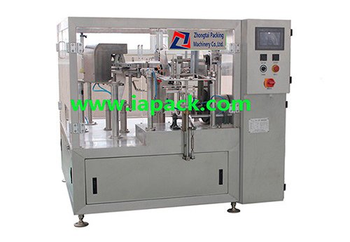 Оснащенная шестью рабочими станциями машина ZG6-300 применяется в основном для фасовки твердых, гранулированных, жидких, а также пастообразных материалов и порошков. Машина может формировать пакеты различных форм, объем дозирования от 5 до 3000 г, максимальная производительность 45 пакетов в минуту.