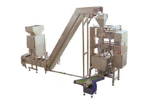 Этот упаковочный блок состоит из вертикальной вакуумной упаковочной машины для вакуумирования и фасовки, линейных весов, вертикального ковшового элеватора для подачи, платформы для поддержки весов и конвейера для снятия готовых пакетов. Он объединяет функции автоматического изготовления пакетов, взвешивания, наполнения, вакуумирования, запайки, печати и резки. Максимальная скорость: 30 пакетов в минуту.