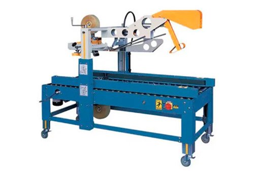 Это система с боковым ременным приводом и пневматическим складыванием клапанов. Она оснащена регулировкой с помощью рукоятки, выдерживает вес до 30 кг и заклеивает короба размером от Ш150-500 мм, В110-500 мм, Д250-600 мм. Головка для ленты вмещает рулоны 900 м. Производительность составляет 9-10 коробов в минуту для длины 300 мм. Стол из нержавеющей стали облегчает перемещение. Интегрируется с оборудованием конца линии. Для привода сжатый воздух не требуется.