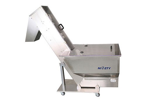 Податчик бутылок используется для автоматического подъема и подачи бутылок россыпью на последующие рабочие станции, такие как раскладчики или моечные машины. Он имеет закрытую конструкцию, защищающую от загрязнений, и большую вместимость бункера 200 л, что снижает нагрузку на рабочих. Машина портативна за счет самоориентирующихся колес, имеет размеры 1800×820×1800 мм и изготовлена из нержавеющей стали SS304 для гигиены и долговечности.