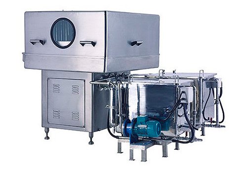 Полуавтоматическая моечная система сочетает функции мойки вращающимися и стационарными форсунками. Производительность значительно увеличена за счет непрерывного процесса загрузки, мойки, сушки и выгрузки. Т.е., простои исключены. Скорость вращения ротора с форсунками плавно регулируется специальным блоком. Машина отвечает текущим требованиям GMP.