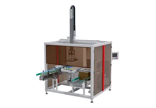 The Machine automatically arranges and packs bottled, boxed, or canned products into cartons. It integrates product arrangement, grabbing, and packing into one unit. Using servo-driven lifting and transfer for precision, it handles carton sizes from L200-500xW150-400xH120-400mm. The machine operates at a speed of 6 to 10 cycles per minute, packing single or multiple cases efficiently.