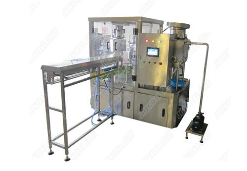 This machine is full automatic production line with such processes: automatic pouch-loading, fixed-position filling, cleaning spout, cap feeding and inserting, pouch position testing, cap screwing, quality production output. Packing sped is 3,600 – 6,000 pouches per hour.
