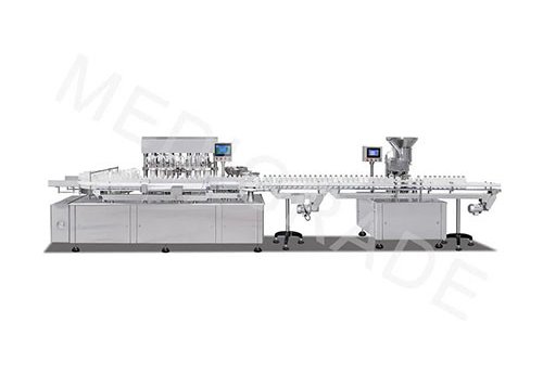 The machine is a straight line intermittent full serving filling machine. The large dose solvent bottle enters the synchronous belt through the bottle plate and completes the filling and plugging of the liquid in the process of intermittent transmission, and sends it to the downstream equipment or out of the bottle storage plate.
