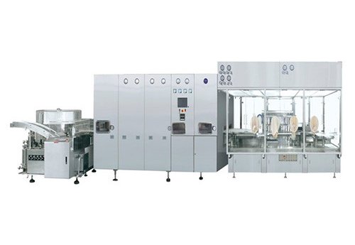 The linkage line consists of vertical ultrasonic washing machine, hot air circulation sterilization tunnel, filling and sealing machine. It can be used in combination or in single machine. Output: 36 000 pcs/h