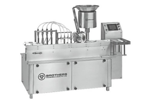 The Automatic Four Head Volumetric Motion type Liquid Vial Filling with Vacuumetric Rubber Stoppering Machine Model LIQFILL-100iR.Motion is suitable for Round Vials with maximum speed of 120 Vials per minute. The Machine can give Maximum speed of 120 Vials per minute depending on nature of Liquids, Vial Neck Size and Fill Volume.