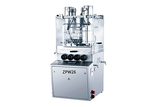 The machine is designed for producing core-covered tablets, a recent innovation in tablet technology. It's a fully enclosed machine, ensuring cleanliness and preventing contamination, and complies with GMP standards. It can also function as a regular or double-layer tablet press. The ZPW26 features programmable controls and a double detection mechanism for quality assurance.