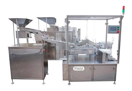 TFM-60A Effervescent Tube Filler is the latest model designed for packaging effervescent tablets into individual tubes. This unit was designed for layered filling of tablets into a tube and then press cap with silica. Capacity: up to 60 tubes/min.